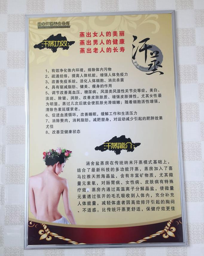 涵舍盐蒸房在传统纳米汗蒸模式基础上,结合了新科技的多功能汗蒸,蒸房加入了喜马拉雅天然海晶盐,含有丰富的矿物质,尤其微量元素氡,对肠胃病、女性病、皮肤病有特殊的作用,蒸房内通过高温离子分解晶盐,使微量元素透过张开的毛孔吸收到人体内,充分补充人体能量,减轻体虚者因高效排汗引起的胸闷、不适感,比传统汗蒸更舒适,保健作用更佳!