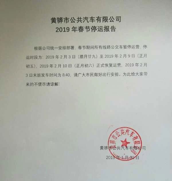 2019年2月4日—2019年2月6日(农历腊月三十至正月初二)停运3天;